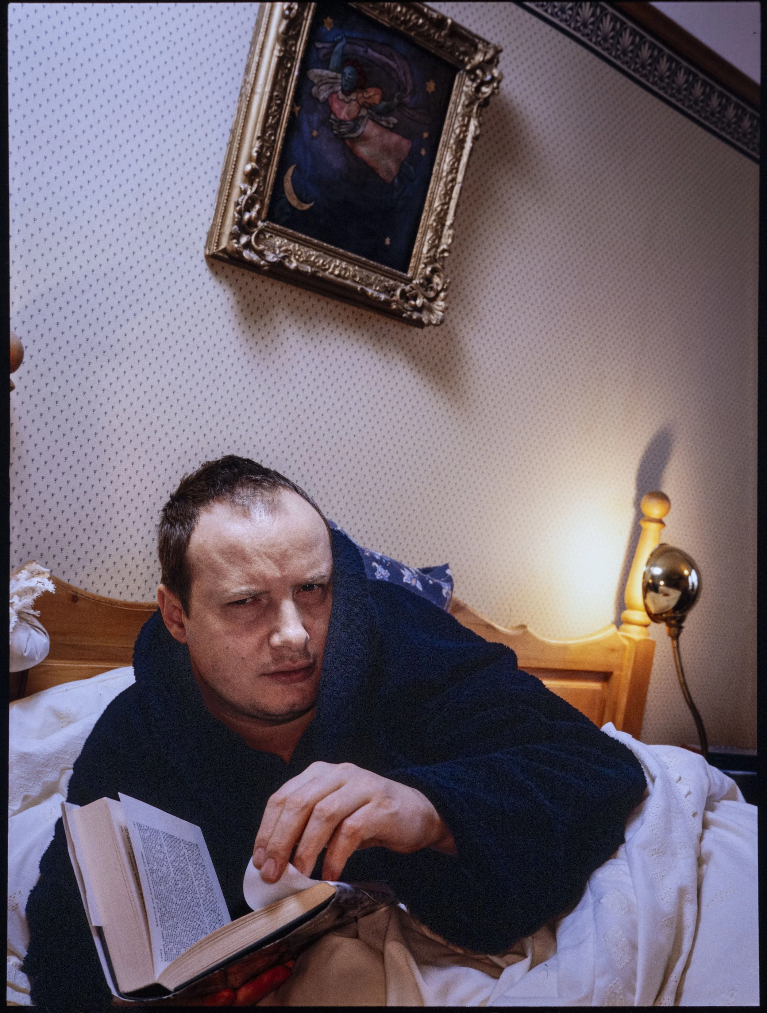 A man lying on a bed with a surprised or confused expression, holding open a book. The room has patterned wallpaper, a framed picture of a religious or mystical figure on the wall, a lamp with a shiny metallic base, and wooden bed frame.